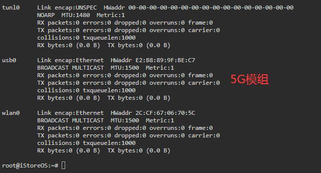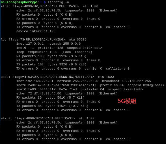 这样,网络接口就设置完成了。稍等片刻,即可见到usb0(5G模组)获取了IP地址: