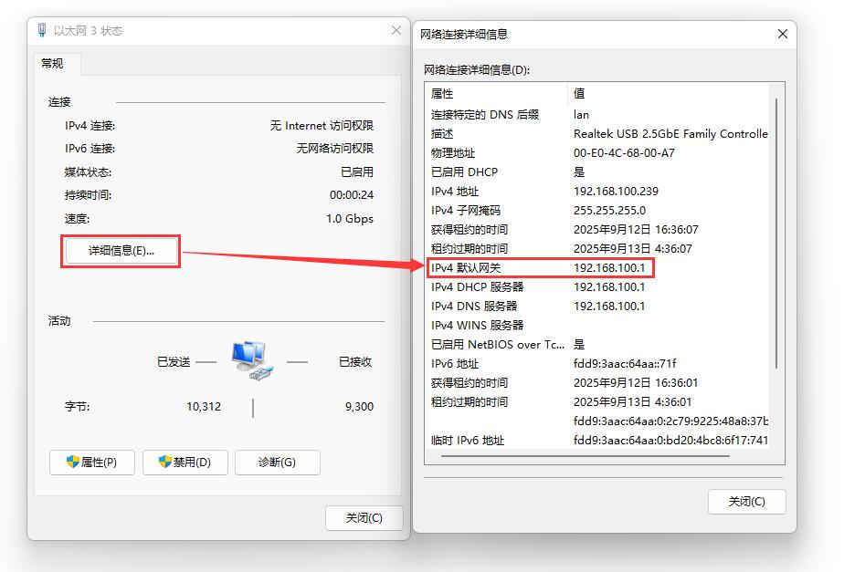 iStoreOS默认的LAN是树莓派5的千兆网口,因此我们将树莓派5的千兆网口连接至PC,系统启动后,我们在Windows设置中找到网络和Internet,在以太网中打开连接的网络查看默认网关的IP地址,这个地址就是iStoreOS的后台配置页面地址,如图所示,本文测试的地址为192.168.100.1: