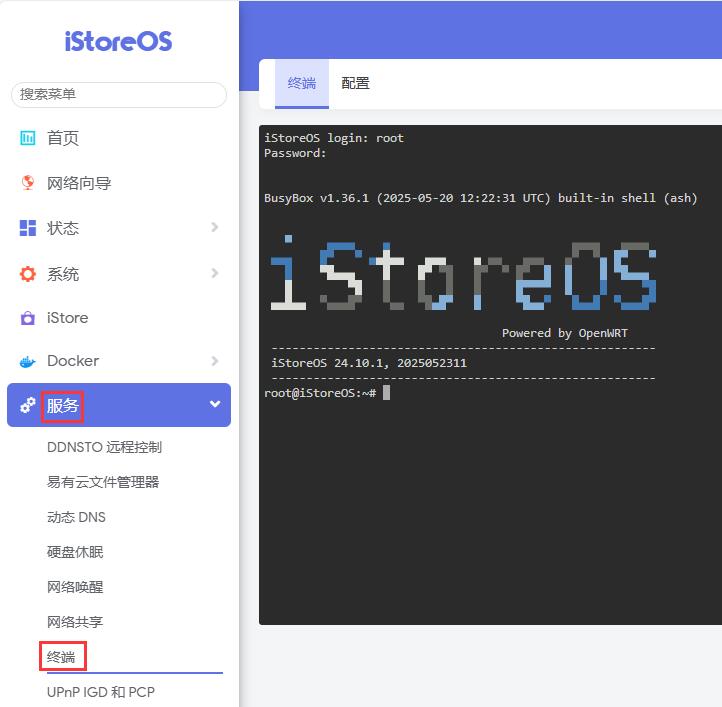 点击“服务 - 终端”,登录iStoreOS的终端,用户名为root,默认无密码: