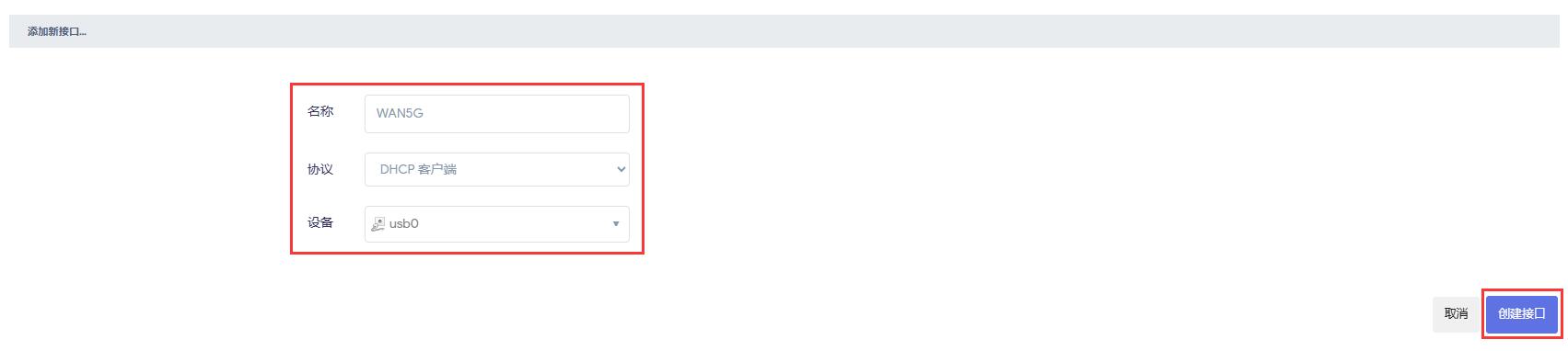 “名称”设置为“WAN5G”(可自定义),“协议”选择“DHCP客户端”,“设备”选择“usb0”,然后点击“创建接口”按钮: