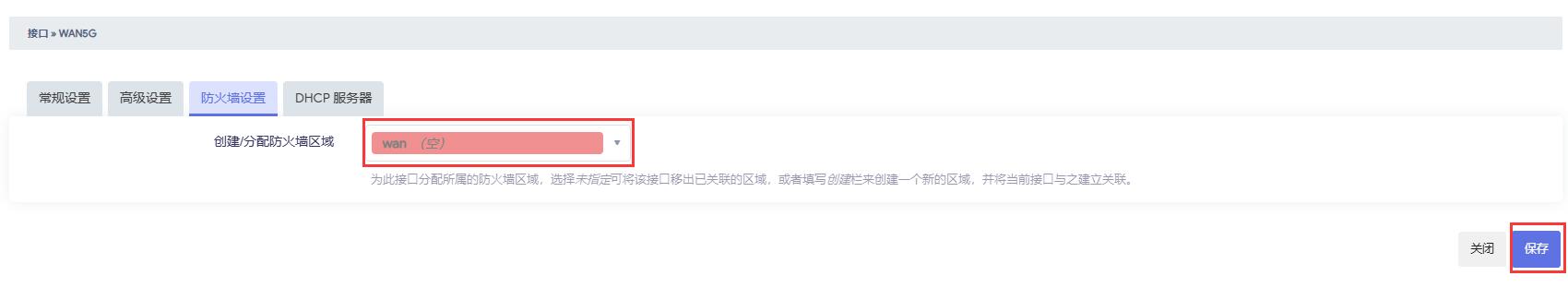 在“防火墙设置”中,将“创建/分配防火墙区域”设置为“wan”,然后点击“保存”: