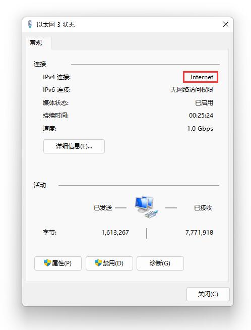 此时,整套树莓派5+5G模组相当于一个无线路由器,与树莓派5相连的PC可以通过5G模组上网。PC网卡的属性显示可以连接Internet:
