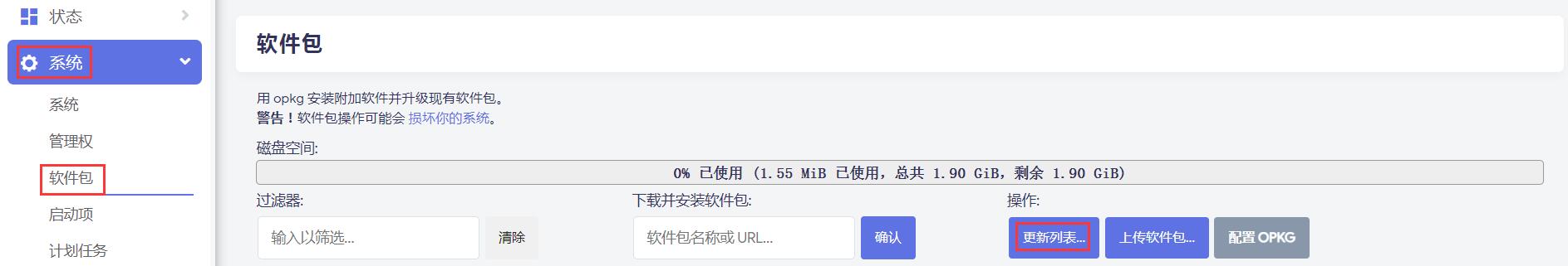 点击“系统 - 软件包”,点击“更新列表”按钮:
