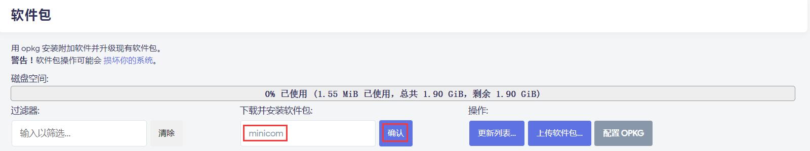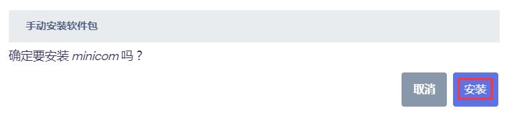 在“下载并安装软件包”下面的框内填写“minicom”,然后点击“确认”: