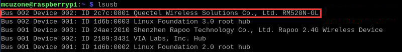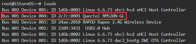 然后登录终端,在终端中设置串口,以RM520N-GL为例,在终端中执行命令lsusb,如下图所示: