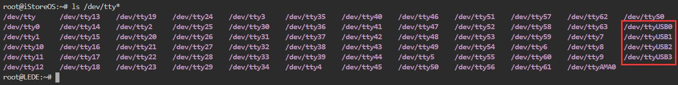 执行上述两条命令之后,再执行ls /dev/tty*,此时应该能看到dev设备下有生成ttyUSB0-3四个设备: