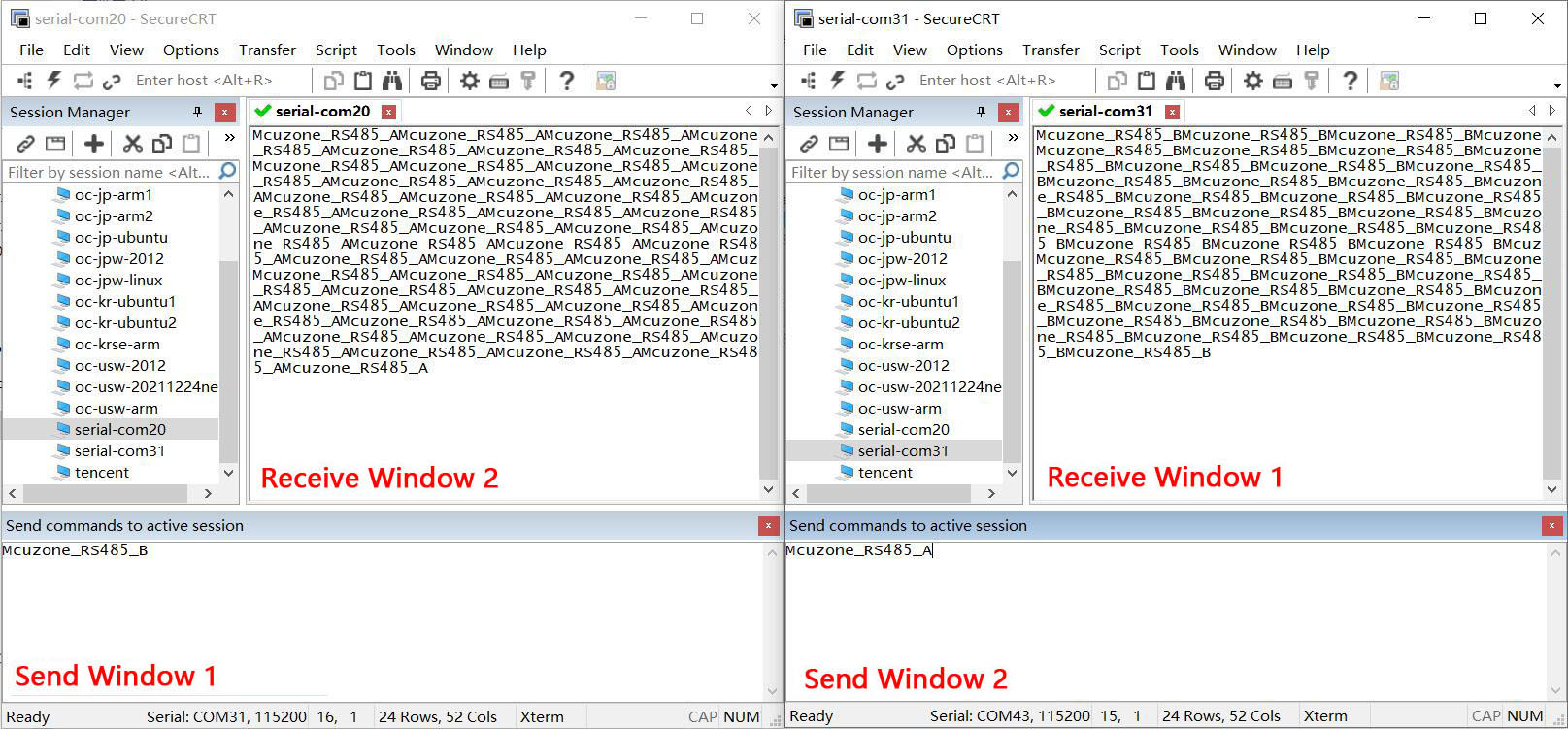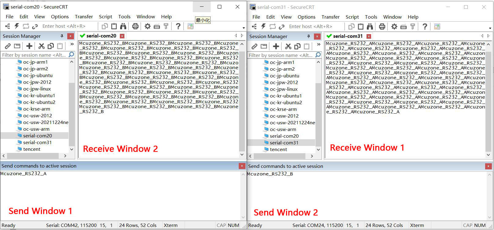 Connect RS232_A and RS232_B to a PC via USB-to-RS232 modules respectively: