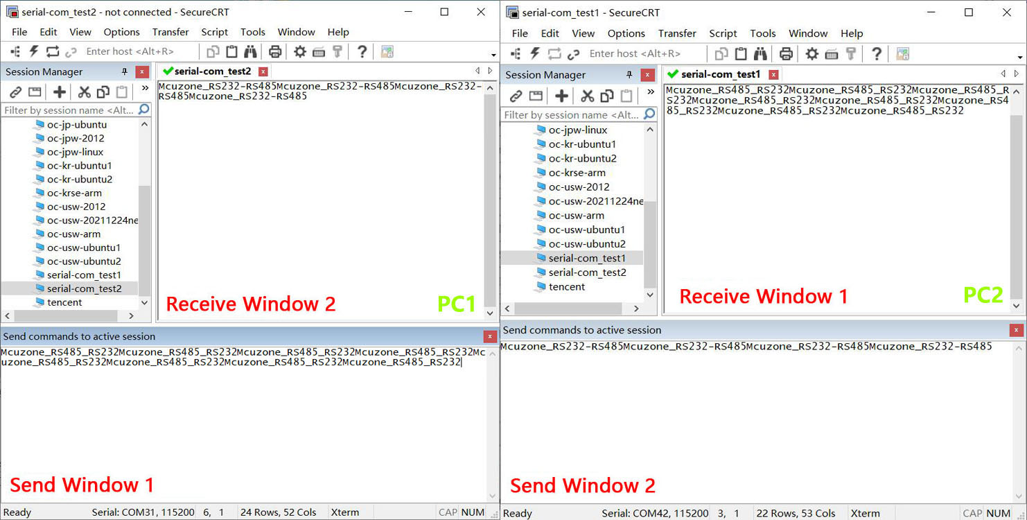 Connect RS485_B on expansion board 1 to PC1 via a USB-to-RS485 module, and connect RS232_B on expansion board 2 to PC2 via a USB-to-RS232 module. Use serial port tools on the two PCs to send and receive data to each other: