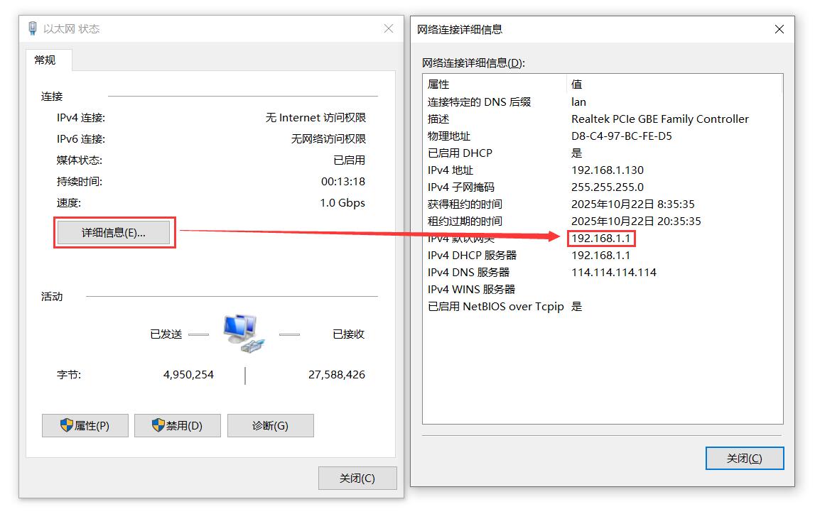 系统默认将扩展板的千兆以太网作为LAN。将千兆以太网连接至PC,在Windows设置中找到网络和Internet,在以太网中打开连接的网络查看默认网关的IP地址,这个地址就是OpenWrt系统的后台配置页面地址,如图所示,本文测试的地址为192.168.1.1: