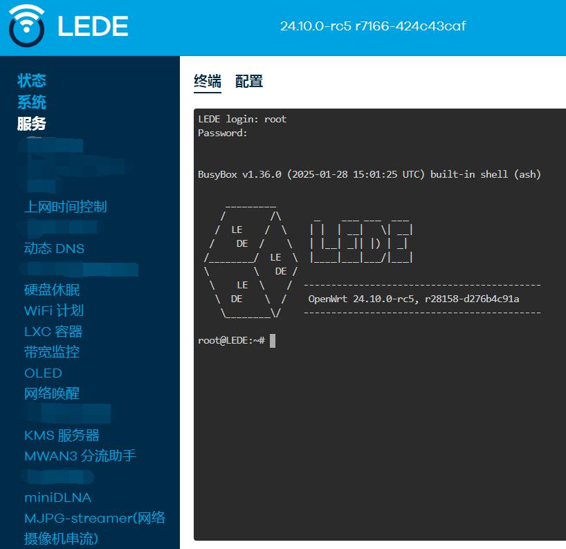 点击“服务 - 终端”,登录终端,默认用户名root,密码为password: