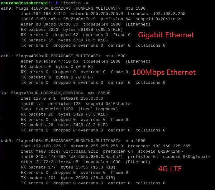将千兆以太网接上级路由器,树莓派终端执行ifconfig -a,显示eth0为千兆以太网,eth1为百兆以太网,usb0为4G LTE(以高通4G为例):