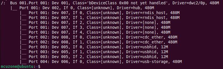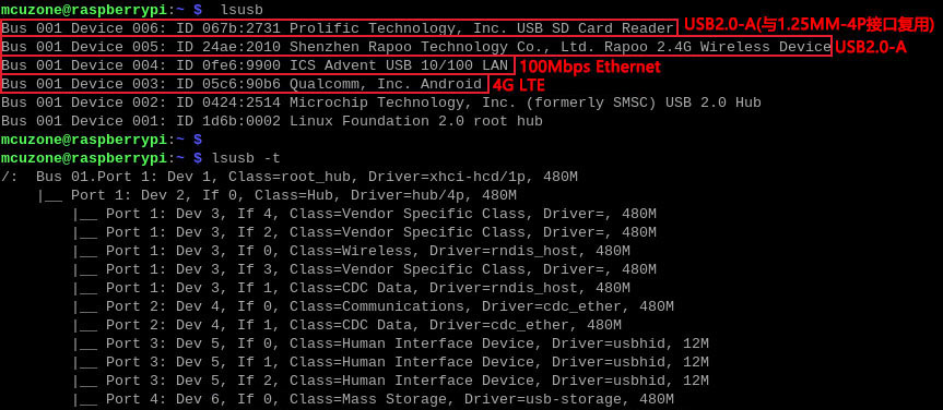 在树莓派终端中执行lsusb及lsusb -t,显示如下: