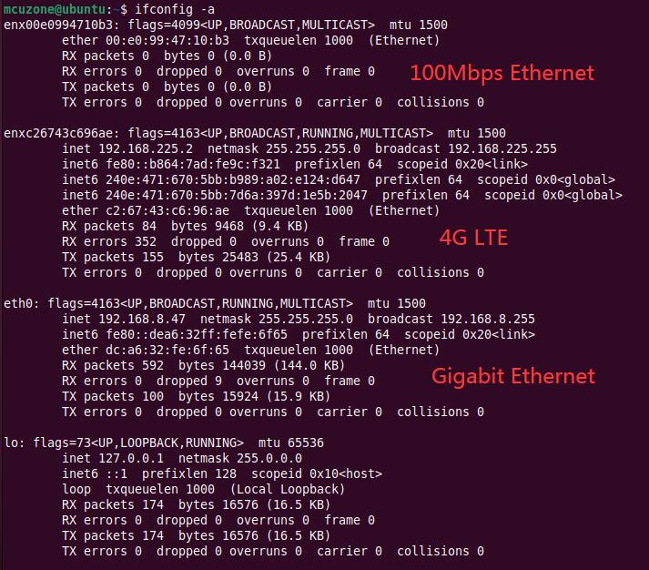 然后将千兆以太网接上级路由器,Ubuntu终端执行ifconfig -a,显示eth0为千兆以太网,两个以“enx”开头的网卡中,获得IP的为4G LTE(以高通4G为例),未获得IP的为百兆以太网: