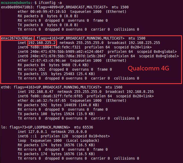 在上一节中,我们提到了已获得IP的以“enx”开头的网卡为即为4G LTE(高通4G,enxc26743c696ae),Ubuntu终端执行ifconfig -a,显示如下: