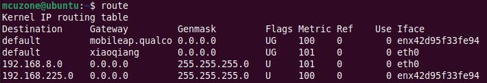在Ubuntu终端中执行route,可见enxc26743c696ae排第一位,因此此时默认通过高通4G上网: