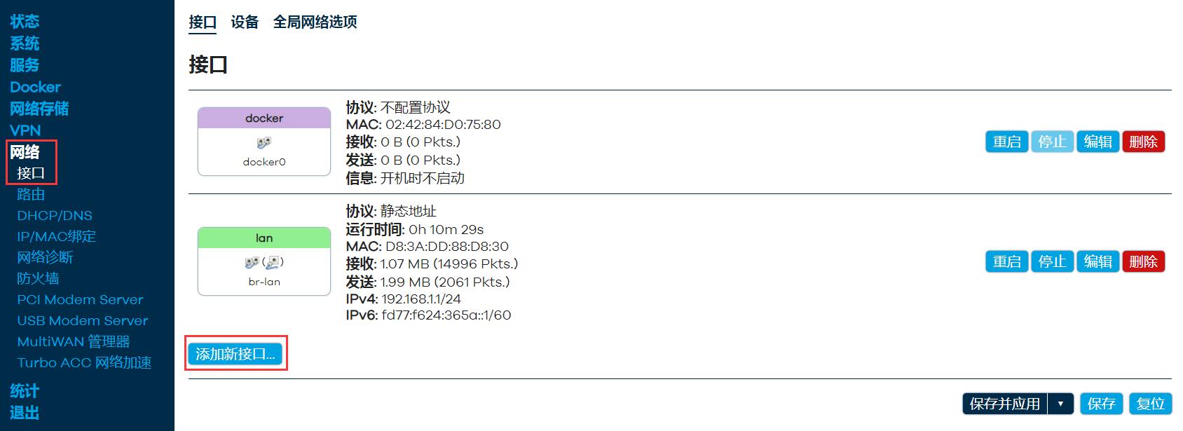 进入“网络 - 接口”,点击“添加新接口...”: