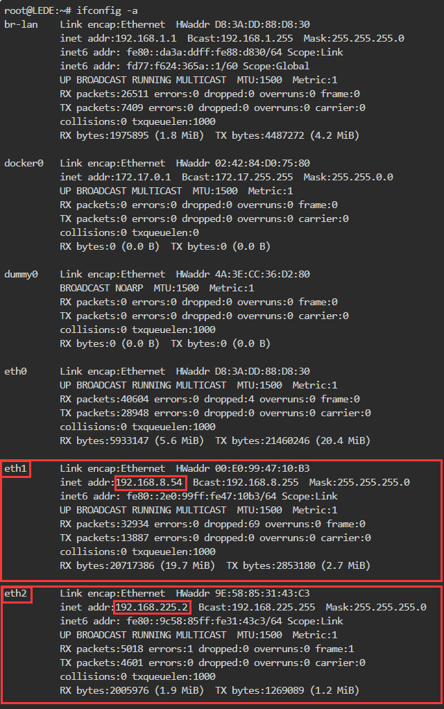 稍等片刻,就能看到两个WAN口都获得了IP地址: