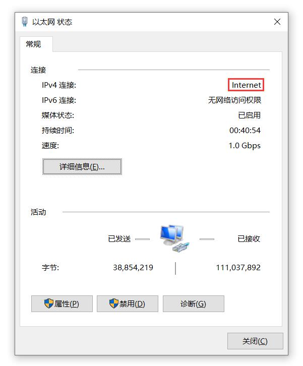 此时连接CM4_4G_IO扩展板的千兆以太网(LAN口)的PC网卡的属性显示可以连接Internet:
