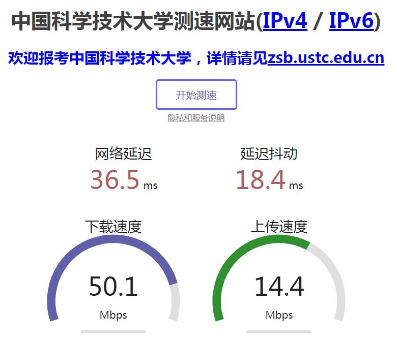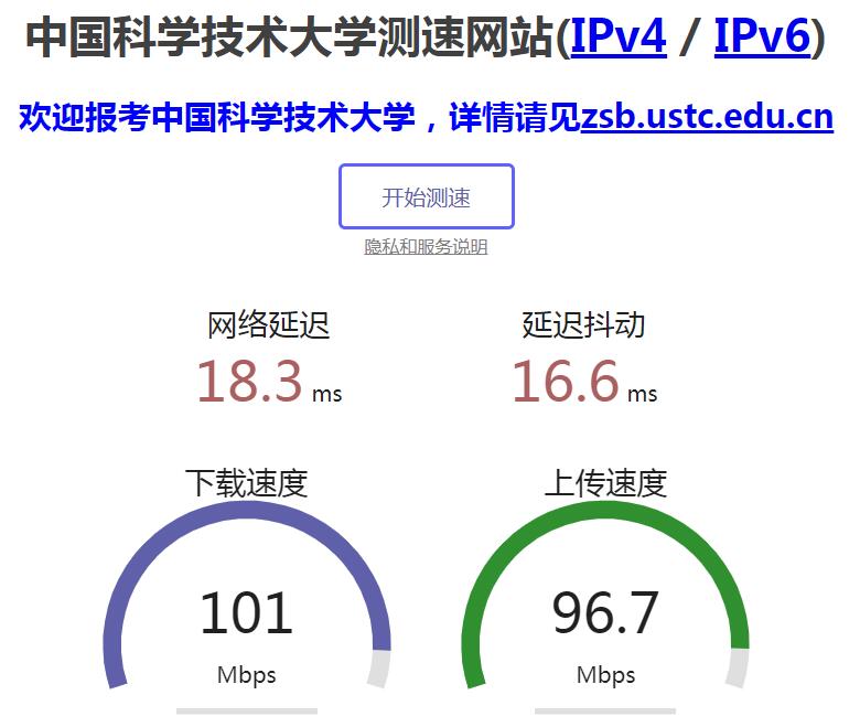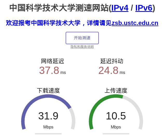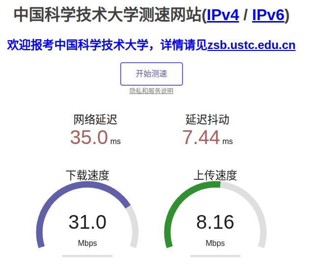 在浏览器中打开https://test.ustc.edu.cn/进行网速测试,结果如下: