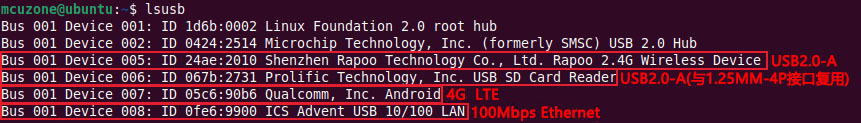 Bus 001 Device 006:USB2.0-A接口(USB读卡器,与1.25MM-4P接口复用)。