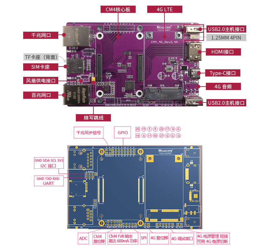 10. GPIO引脚(含UART*1、l2C*1、ADC*1、SPI*1、CM4复位引脚以及其它16个IO);