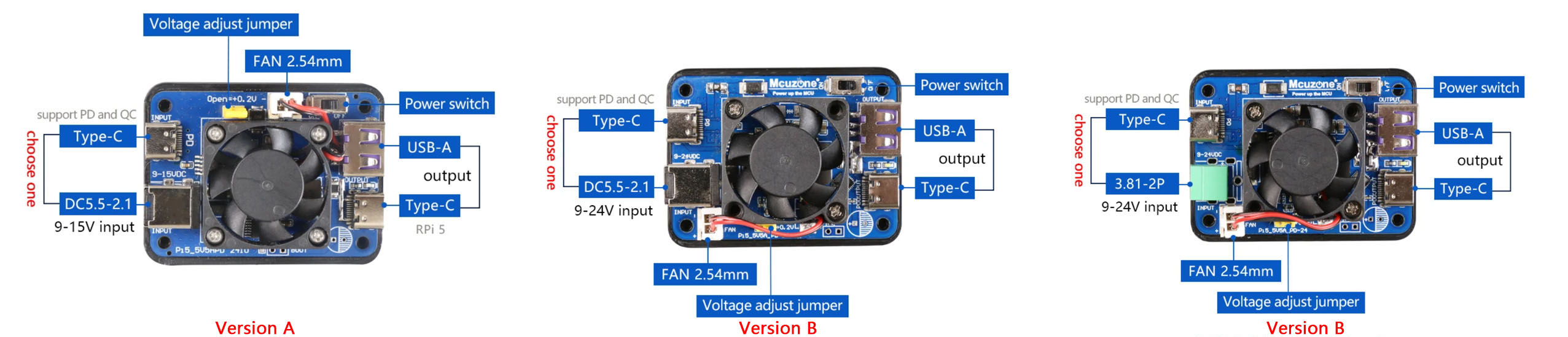 Our 5V5A power modules come in three versions: one is a 5V5A model with 3.81-2p terminal, suitable for industrial settings; another is a general-purpose 5V5A PD version (Discontinued); and the third is a dual PD 5V5A version, it is available in Version A (9-15V input) and Version B (9-24V input), specifically designed for the Raspberry Pi 5.