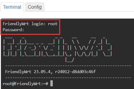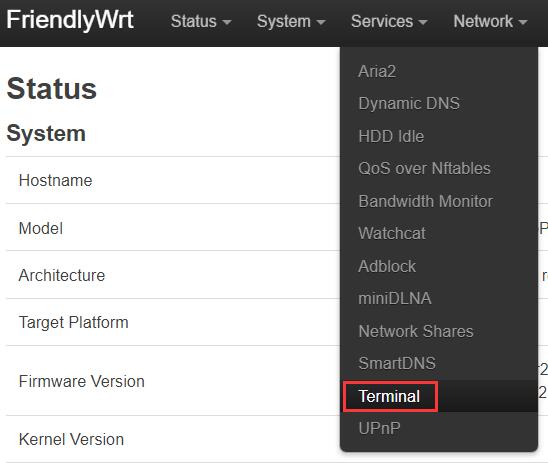 Navigate to "Services - Terminal", log in to the terminal with the default username: root and password: password: