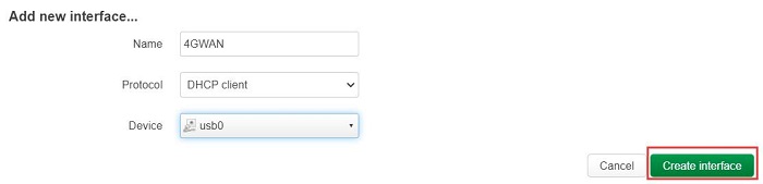Configure as shown in the figure below (the "Name" can be customized), select "usb0" for the "Device", and then click "Create interface":
