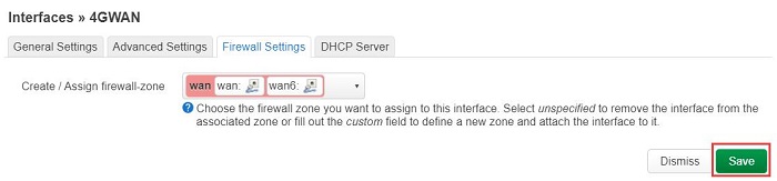 Click on "Firewall Settings", in the "Create / Assign firewall-zone" section, select "wan", and then click "Save":