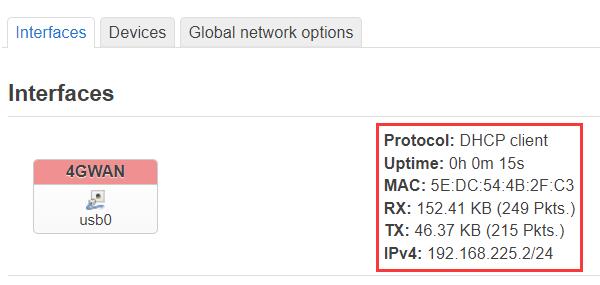 Wait for a moment, and we can see that the 4G module has obtained an IP address: