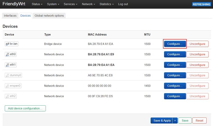 Then navigate to "Network - Interfaces - Devices", and click "Configure..." behind "br-lan":