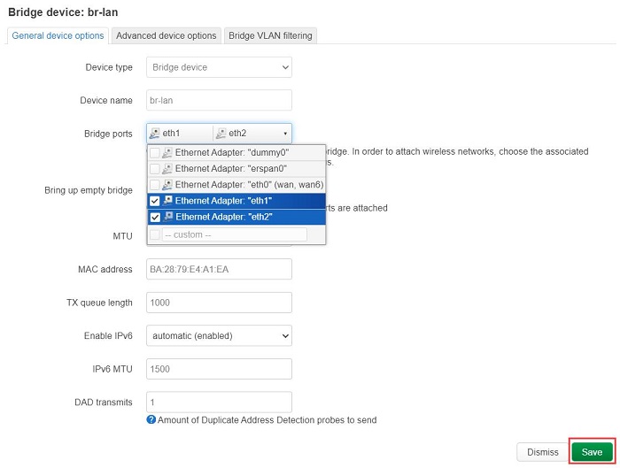 Click the arrow next to "Bridge ports", select both eth1 and eth2, and then click "Save":