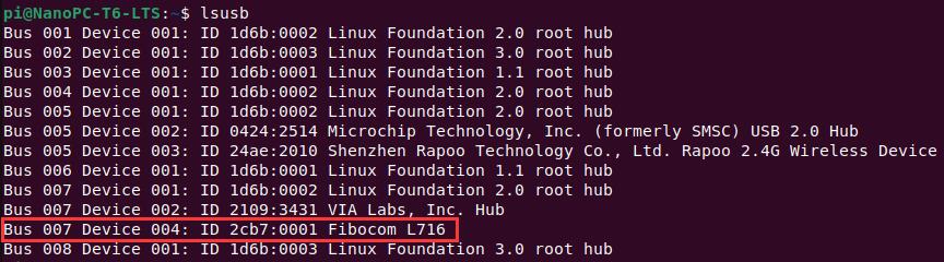 高通4G在使用AT命令前,需要先打开串口,在树莓派终端中执行命令lsusb,如下图所示: