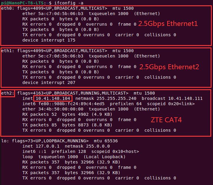 其中eth0、eth1为两个2.5G以太网,eth2为ZTE CAT4,已经正确获得了IP地址。