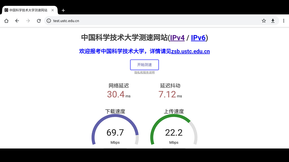 在PC的浏览器中打开https://test.ustc.edu.cn/进行网速测试,结果如下: