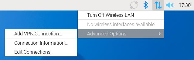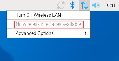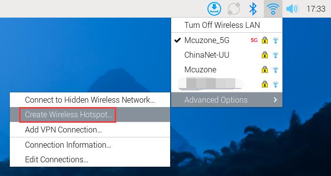 At this point, there is no "Create Wireless Hotspot..." option in Advanced Options, so it cannot be used as a Master (wireless hotspot). The interface is shown in the figure below: