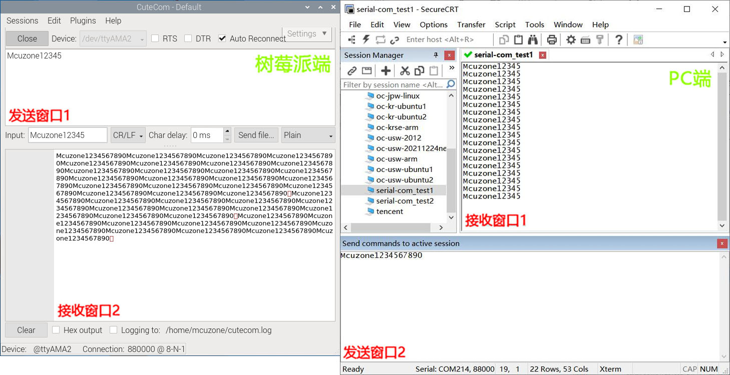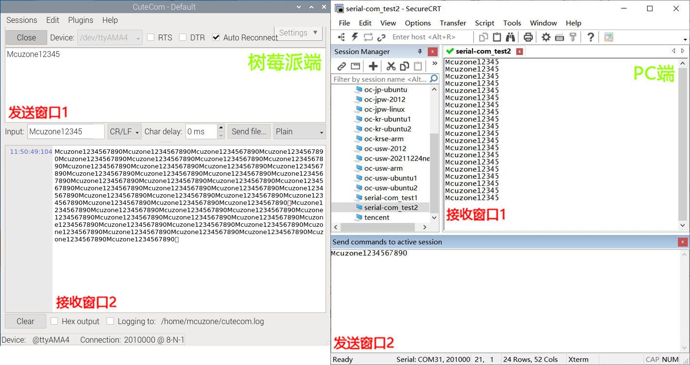 将扩展板的RS232接口通过USB转232模块连接到电脑,各自打开串口软件进行收发,结果如下: