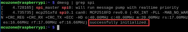 最后重启系统。在终端中输入dmesg | grep spi,查看 SPI 的信息,红框中的信息显示can0识别成功: