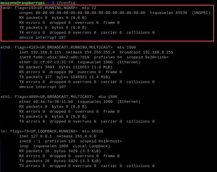 设置完成后输入ifconfig,查看CAN连接,可看到can0: