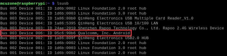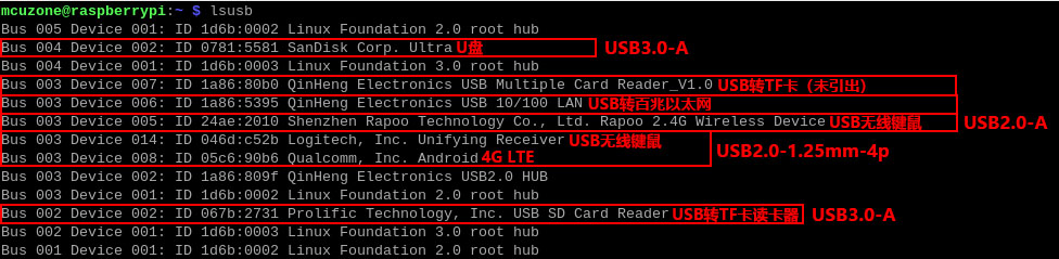 测试以高通4G为例,在树莓派终端中执行lsusb,显示如下,红框中即为4G:
