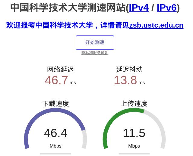 打开https://test.ustc.edu.cn/进行网速测试,结果如下: