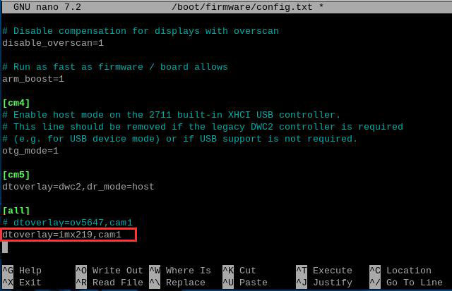 在树莓派终端中输入sudo nano /boot/firmware/config.txt,在最后一行加入下列代码: