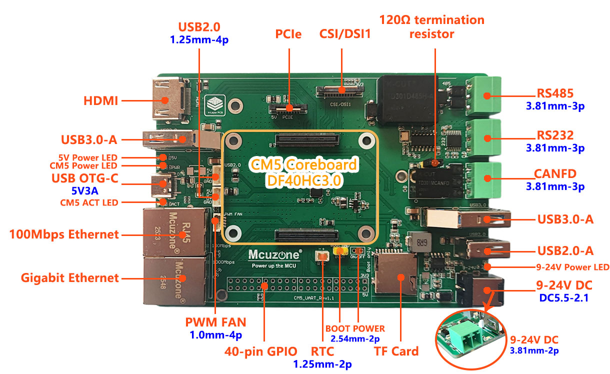 14. 四盏LED灯:9-24V电源输入指示灯、5V电源输入指示灯、CM5核心板电源指示灯和CM5核心板运行指示灯;